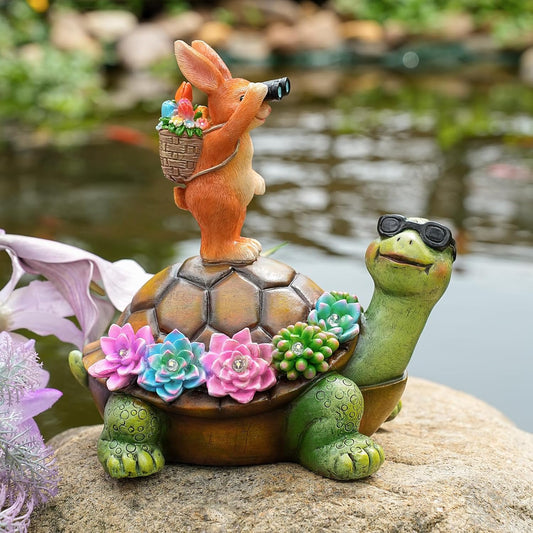 Solar Turtle Garden Statue with Bunny and LED Succulent Flowers – Outdoor Lawn Decor with Lights, Cute Animal Yard Ornament for Patio, Pathway, or Garden Gift (Gnome)