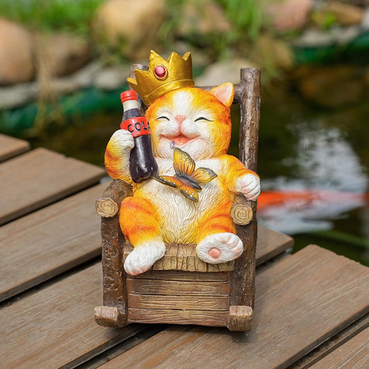 Solar Cat Garden Statue – Funny Orange Tabby Cat with Crown & Cola, LED Butterfly Light, Sitting on Rocking Chair – Outdoor Patio Decor for Yard, Porch, Lawn, or Gift